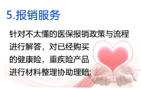 5. 报销服务,针对不太懂的医保报销政策与流程进行解答,对已经购买的健康险,重疾险产品进行材料整理协助理赔。